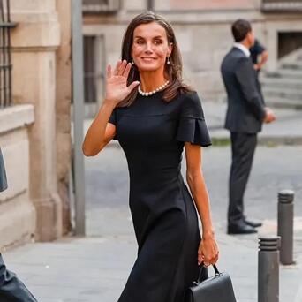 莱蒂齐亚王后和丈夫费利佩六世昨天一同参加表弟胡安的追悼会,她穿着职业小黑裙搭配墨绿色手袋,珍珠项链加上同款耳环精致又时尚。